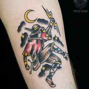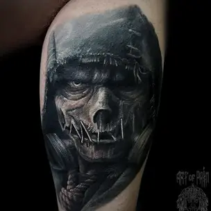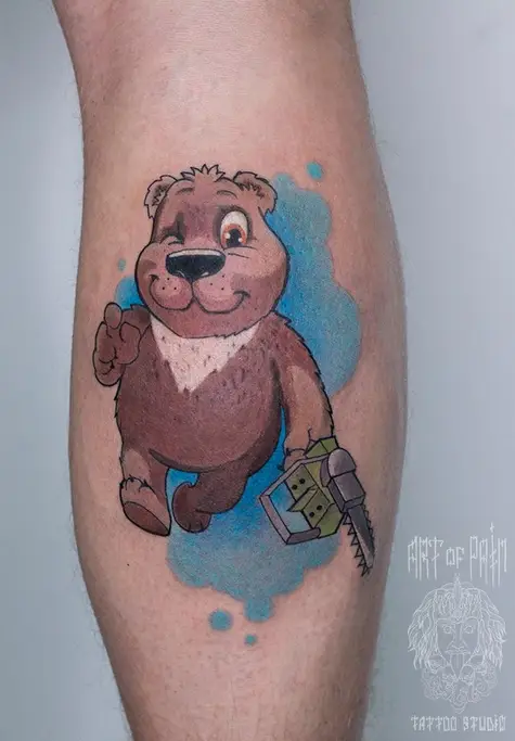 Татуировка мужская нью-скул на голени медведь с бензопилой 1654