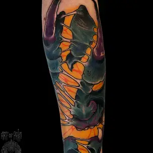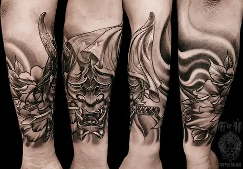 татуировка мужская япония на предплечье маска с оружием 1663
