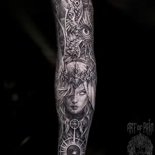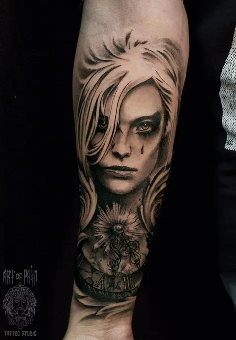 Татуировка мужская black&grey на предплечье плачущая женщина и часы (Слава Tech Lunatic) 1664