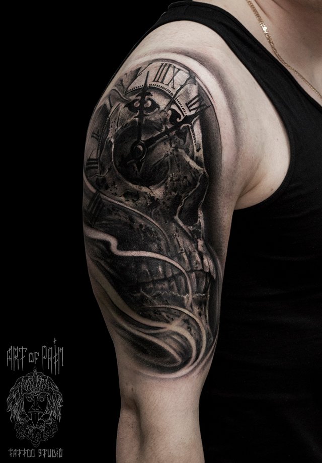 Татуировка мужская хоррор на плече череп и часы (Слава Tech Lunatic) 1736
