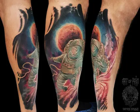 Татуировка мужская реализм на голени космонавт и космос 1744