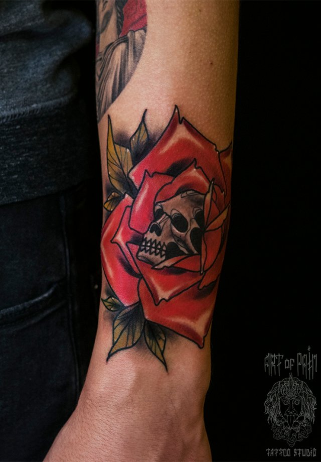 Татуировка мужская нью-скул на предплечье роза с черепом 1795