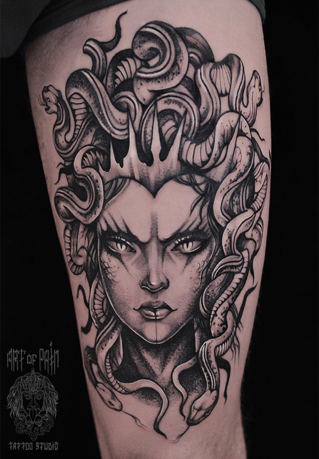 Татуировка мужская black&grey на бедре Медуза Горгона 1802