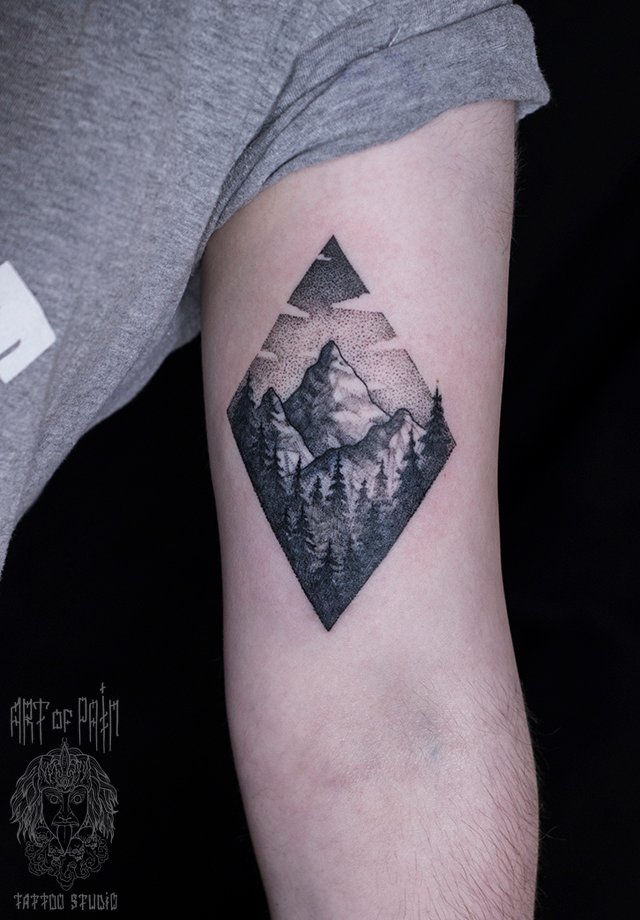 Татуировка мужская дотворк на плече горы 1810