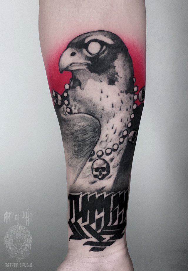 Татуировка мужская дотворк на предплечье сокол и надпись 1850