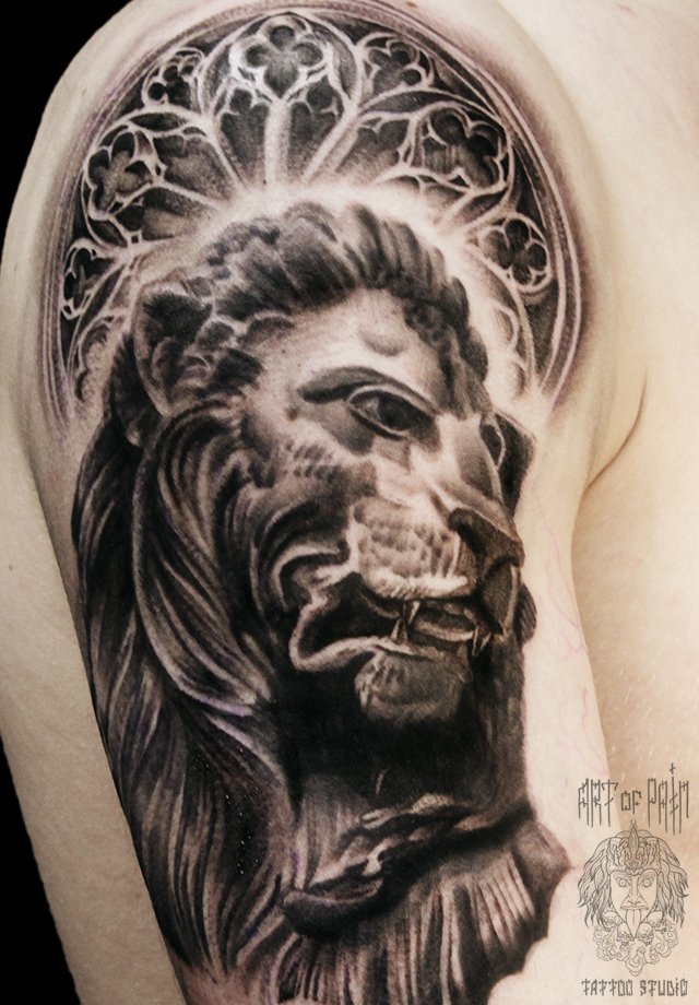 Татуировка мужская чикано на плече лев и арка 1908