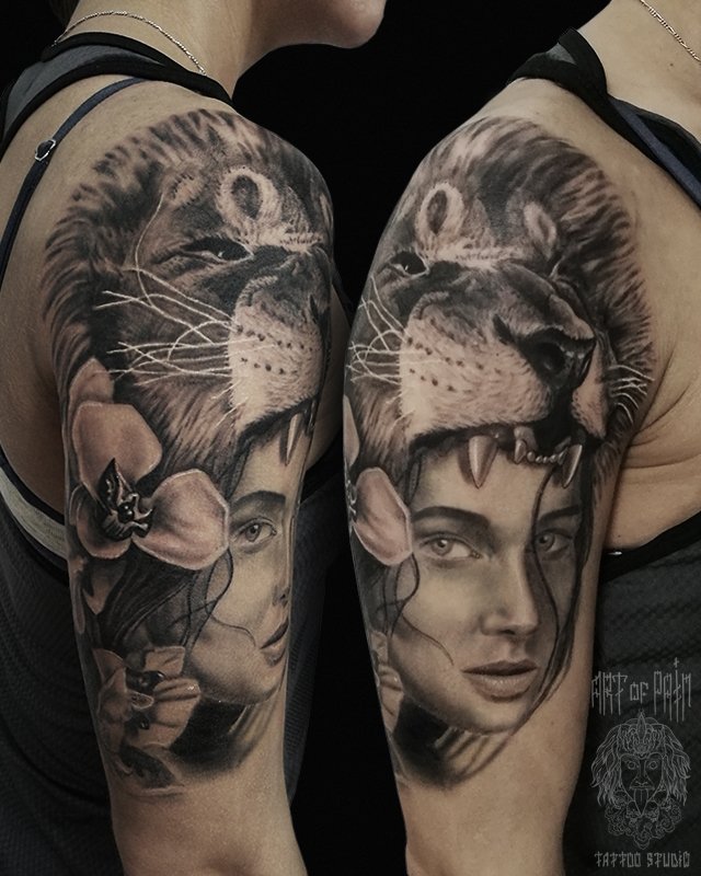 Татуировка мужская реализм на плече дева и лев 1910