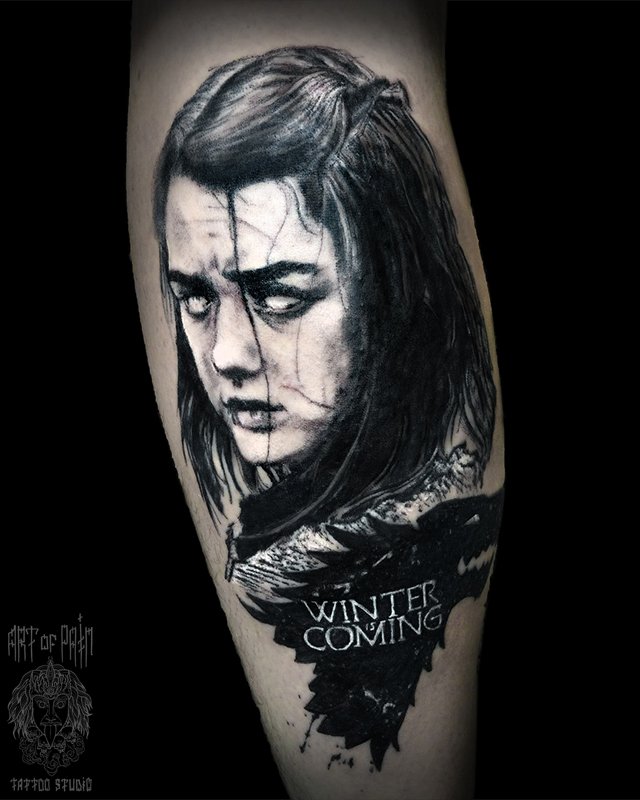 Татуировка мужская реализм на голени Арья Старк 1931
