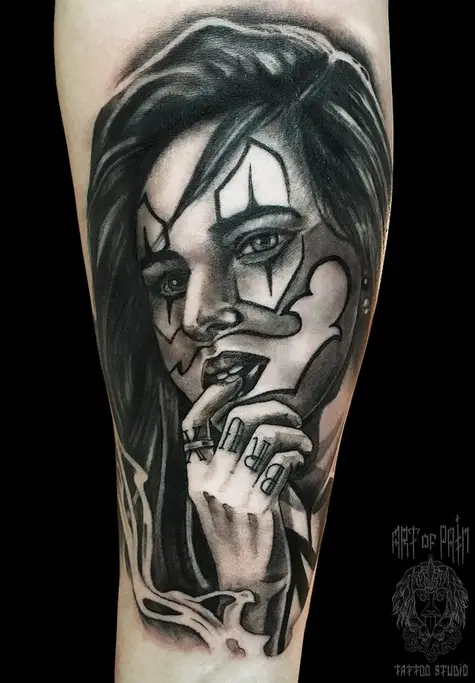 Татуировка мужская чикано на предплечье девушка-клоун 1932