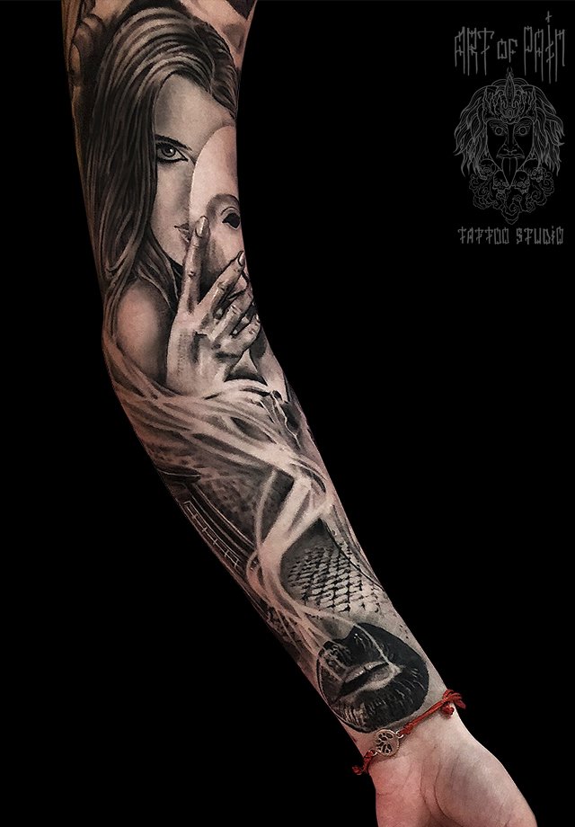 Татуировка мужская реализм тату-рукав девушка, маска, губы, дым 1936