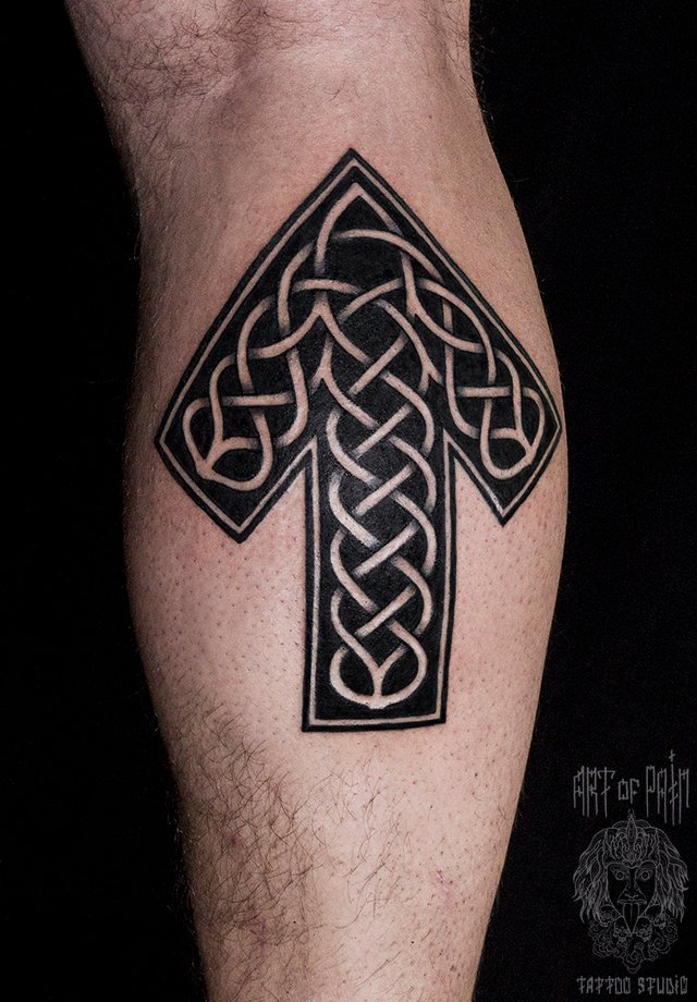 Татуировка мужская кельтика на голени стрела 1946
