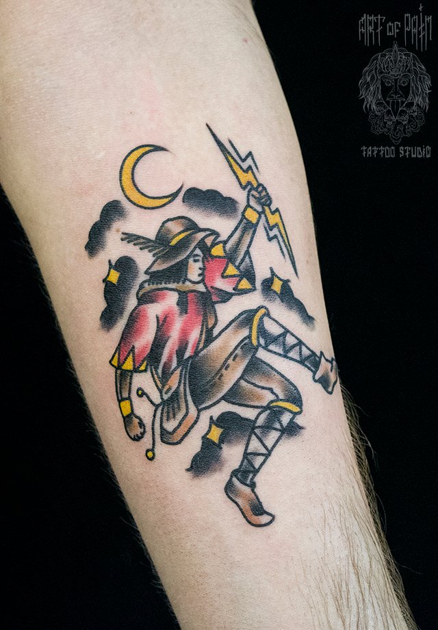 Татуировка мужская нью-скул на предплечье человек с молнией 1974