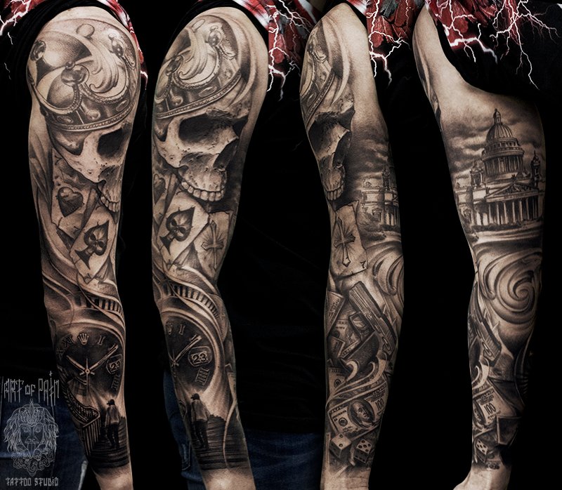 Татуировка мужская black&grey тату-рукав череп и белый дом (Слава Tech Lunatic) 1979