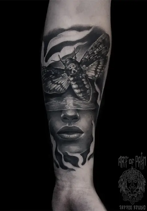 Татуировка мужская black&grey на предплечье дева и мотылек 2001