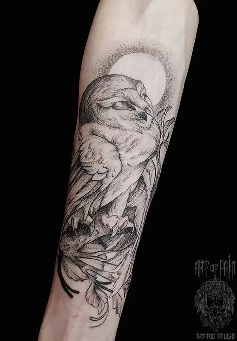 Татуировка мужская графика на предплечье сова на ветке и полная луна 2029