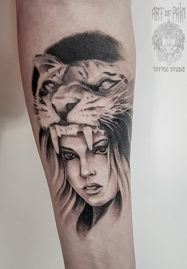 Татуировка мужская black&grey на предплечье девушка в шкуре тигра 2037