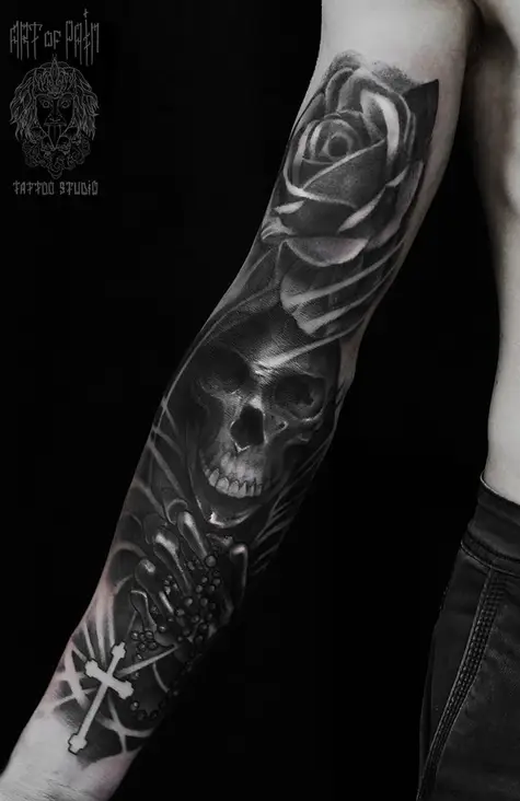 Татуировка мужская black&grey на руке смерть, крест, роза 2060