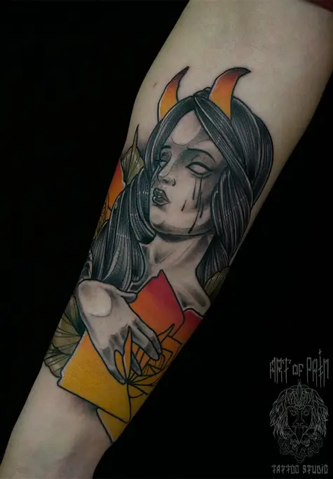 Татуировка мужская нью-скул на предплечье девушка с рогами 2061