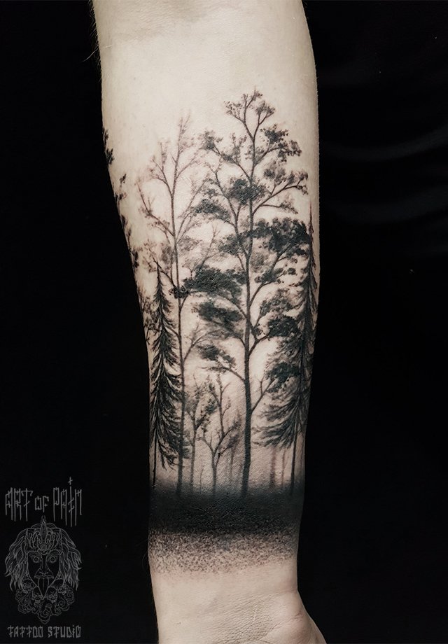Татуировка мужская black&grey на предплечье лес 2063