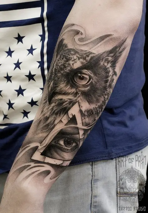 Татуировка мужская black&grey на предплечье сова и всевидящее око (Слава Tech Lunatic) 2070