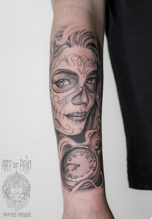 Татуировка мужская чикано на предплечье муэрте и карманные часы 2134