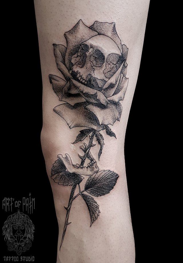 Татуировка мужская дотворк на ноге роза и череп 2142