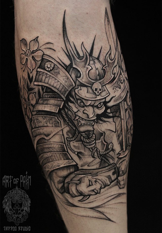 Татуировка мужская графика на голени самурай 2162
