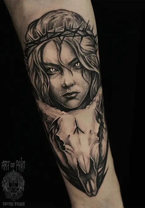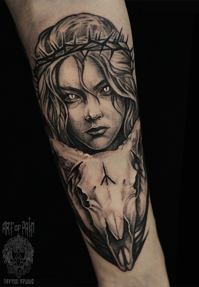 Татуировка мужская black&grey на предплечье девушка и череп животного 2164