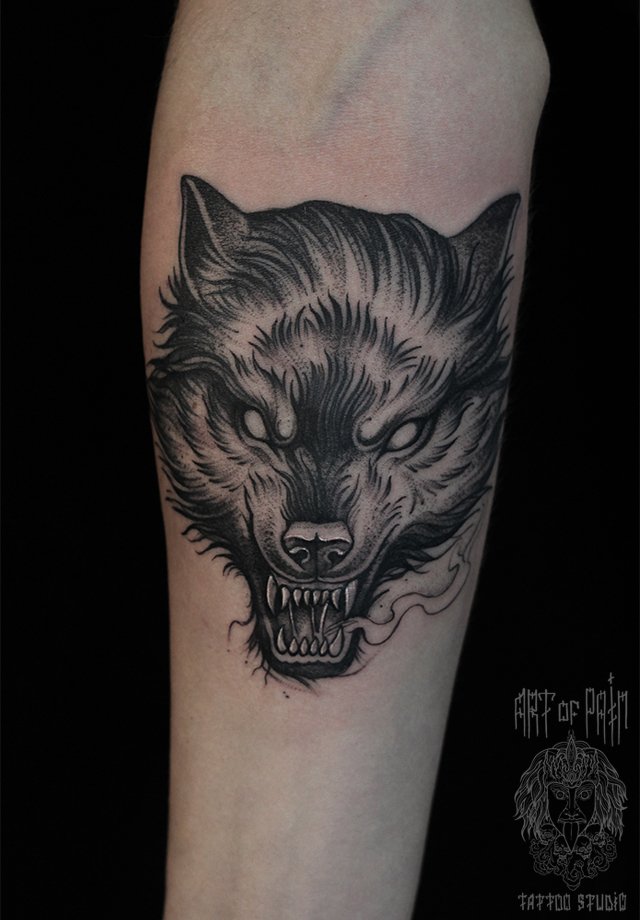 Татуировка мужская графика на предплечье волк скалится 2209