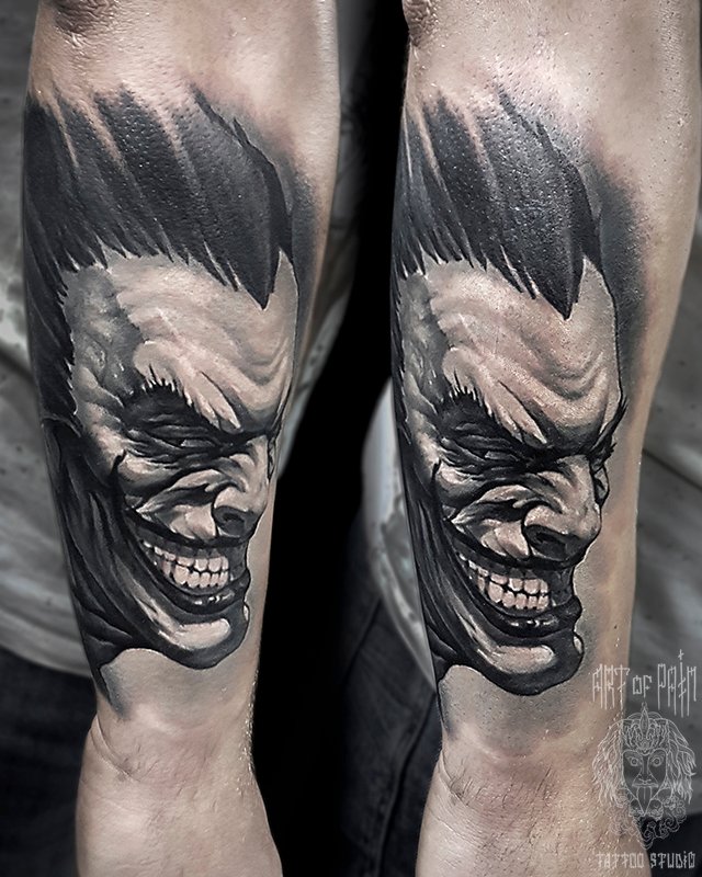 Татуировка мужская black&grey на предплечье джокер 2210