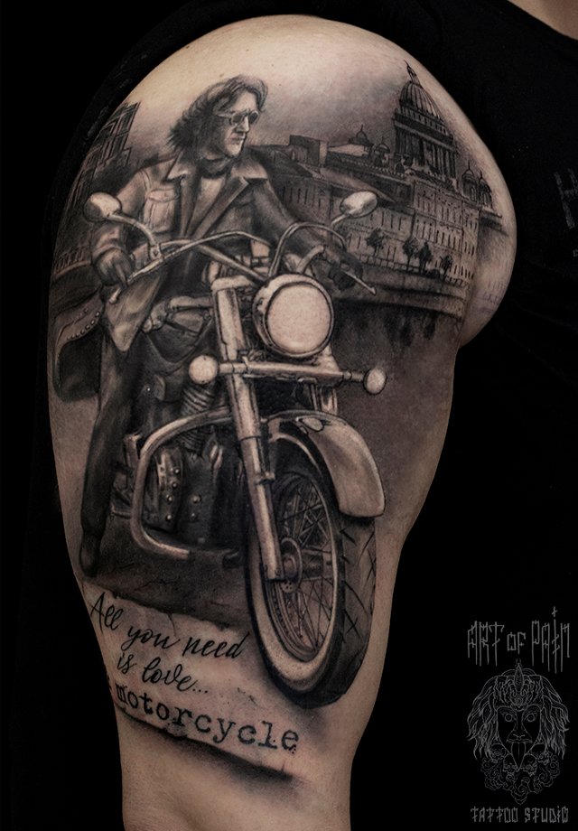 Татуировка мужская black&grey на плече на мотоцикле (Слава Tech Lunatic) 2263