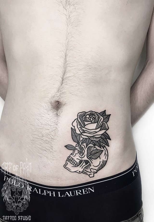 Татуировка мужская графика на животе череп 2328