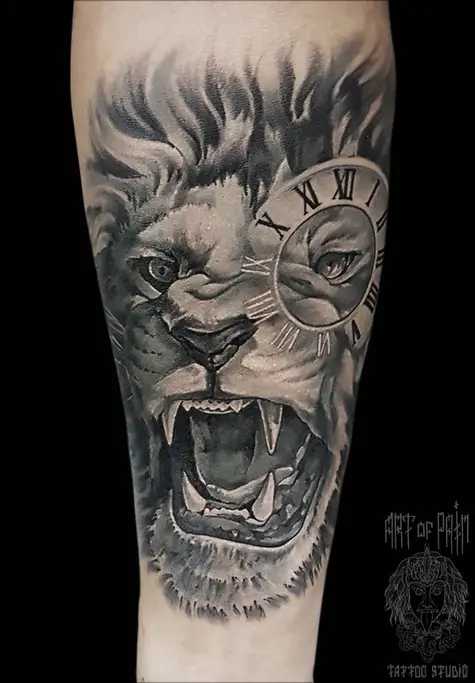 Татуировка мужская black&grey на предплечье лев и часы 2330