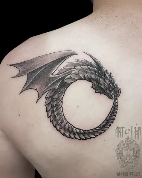 Татуировка мужская black&grey на лопатке уроборос 2334