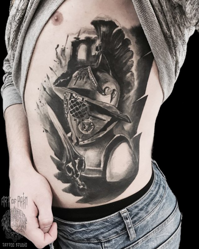 Татуировка женская black&grey на боку рыцарь 2383