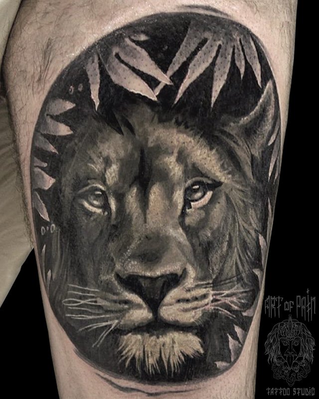 Татуировка мужская реализм на бедре лев 2389