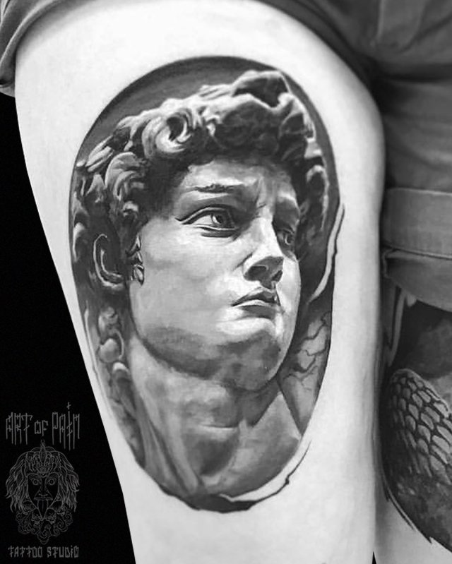 Татуировка мужская реализм на бедре статуя 2390