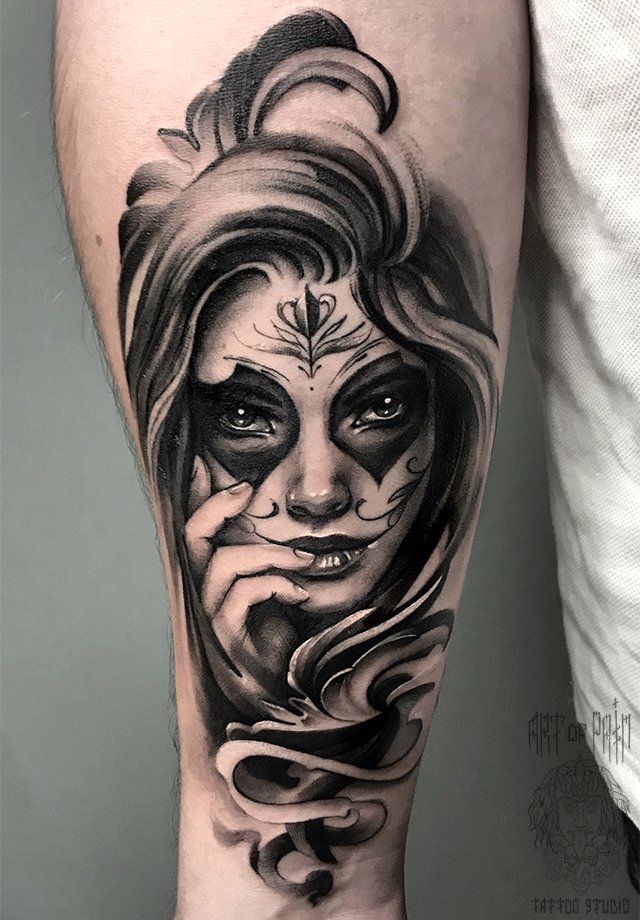 Татуировка мужская чикано на предплечье девушка в образе Муэрте 2416
