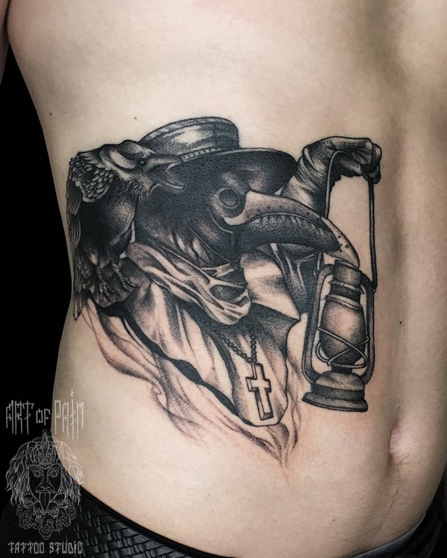 Татуировка мужская графика на боку чумной доктор 2440