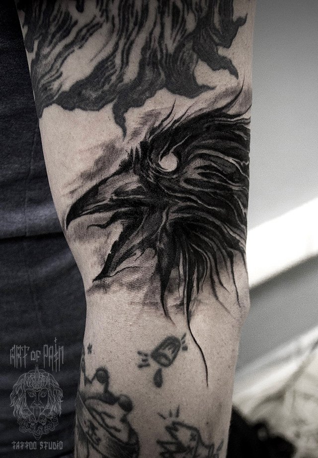 Татуировка мужская black&grey на плече ворон 2450