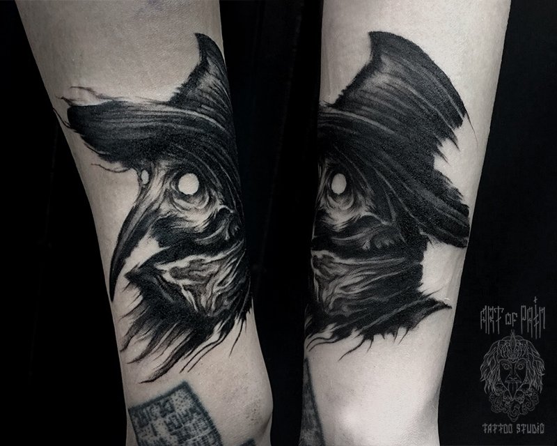 Татуировка мужская black&grey на предплечье чумной врач 2453