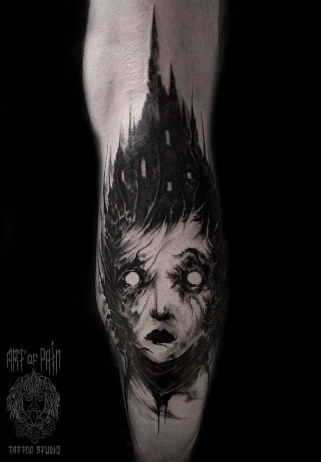 Татуировка мужская black&grey на голени призрак старого дома 2454