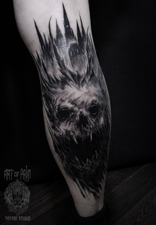 Татуировка мужская хоррор на голени монстр 2477
