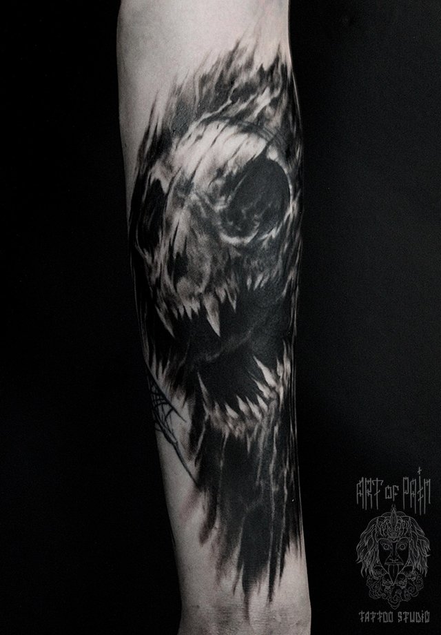 Татуировка мужская хоррор на предплечье череп монстра 2479