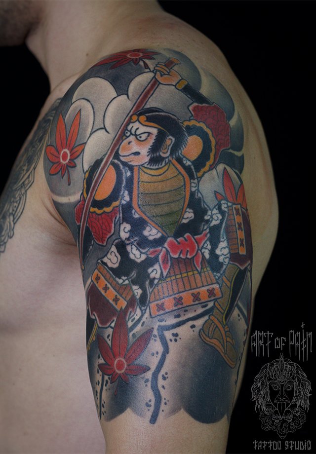Татуировка мужская япония на плече обезьяна-самурай 2493