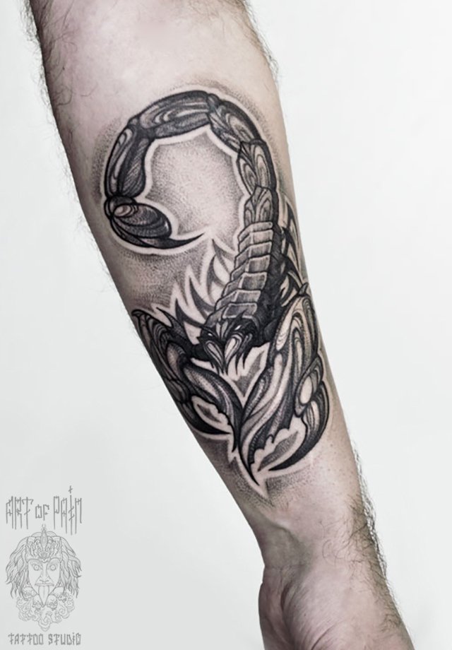Татуировка мужская графика на предплечье скорпион 2496