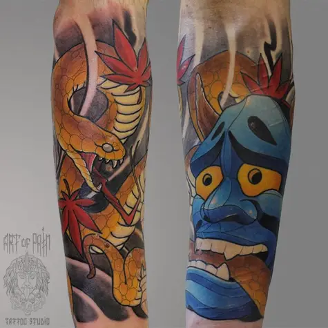 Татуировка мужская япония на предплечье ханья и змея 2508