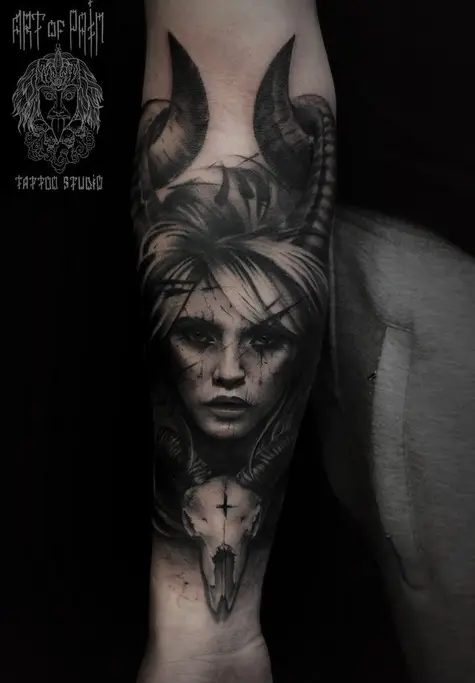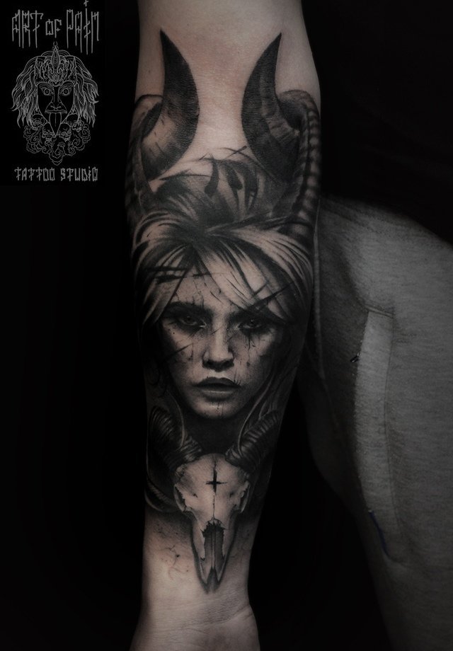 Татуировка мужская black&grey на предплечье девушка (Слава Tech Lunatic) 2515