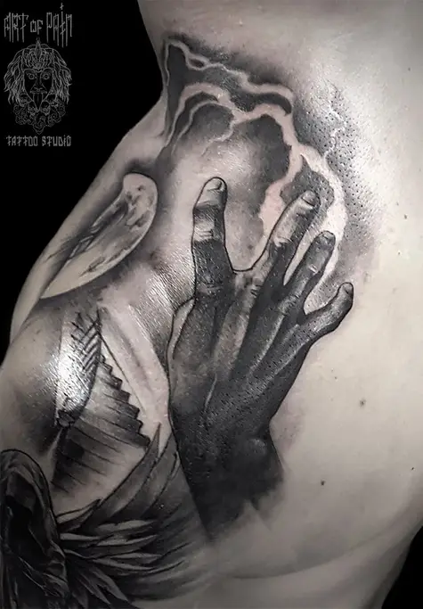 Татуировка мужская black&grey на лопатке рука 2558