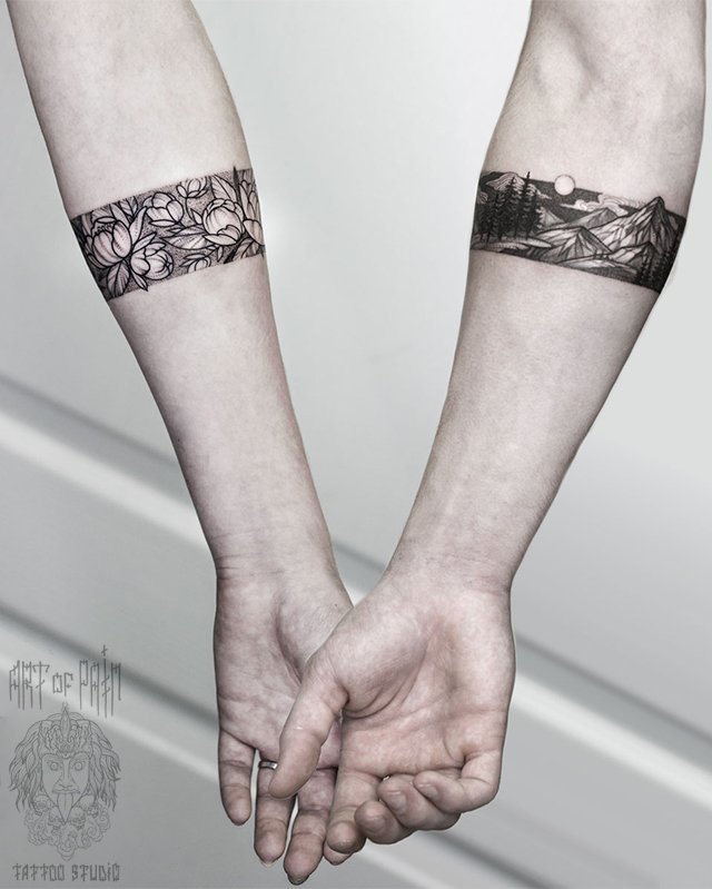 Татуировка мужская графика на предплечье браслеты с пейзажем и цветами 2567